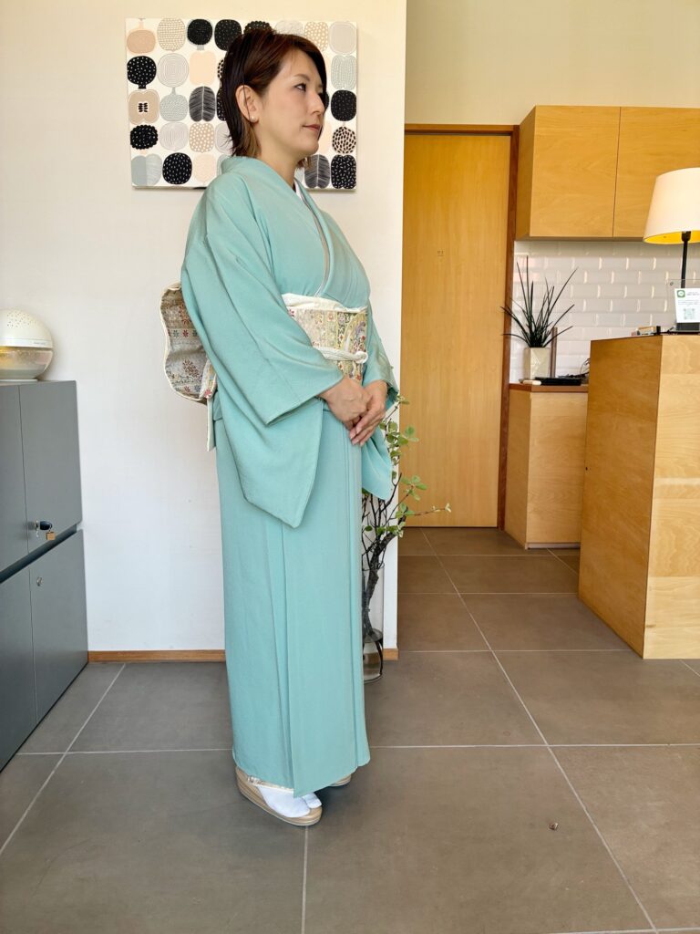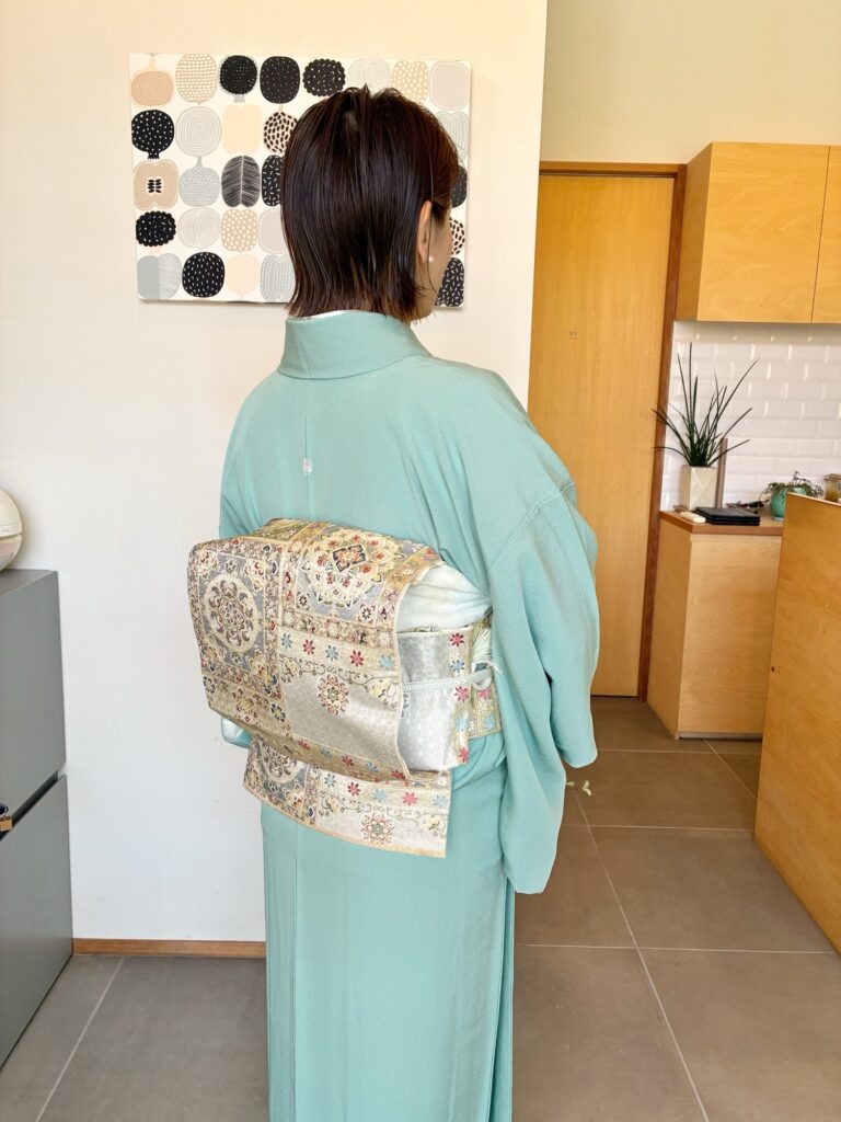 今回お選びいただいたのは、春の陽だまりのようなミントグリーンのお着物。